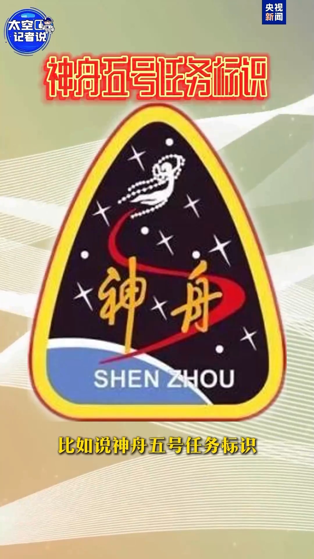 神舟五号任务标识是中国载人航天工程的首枚任务徽章,主体轮廓取自神舟飞船返回舱外形,中心的"S"形同时表达出飞船序号“5”与它的飞行轨迹,最终构成一个凌空腾飞的龙的形象,整体设计蕴含了实现中华民族千年飞天梦想的含义。