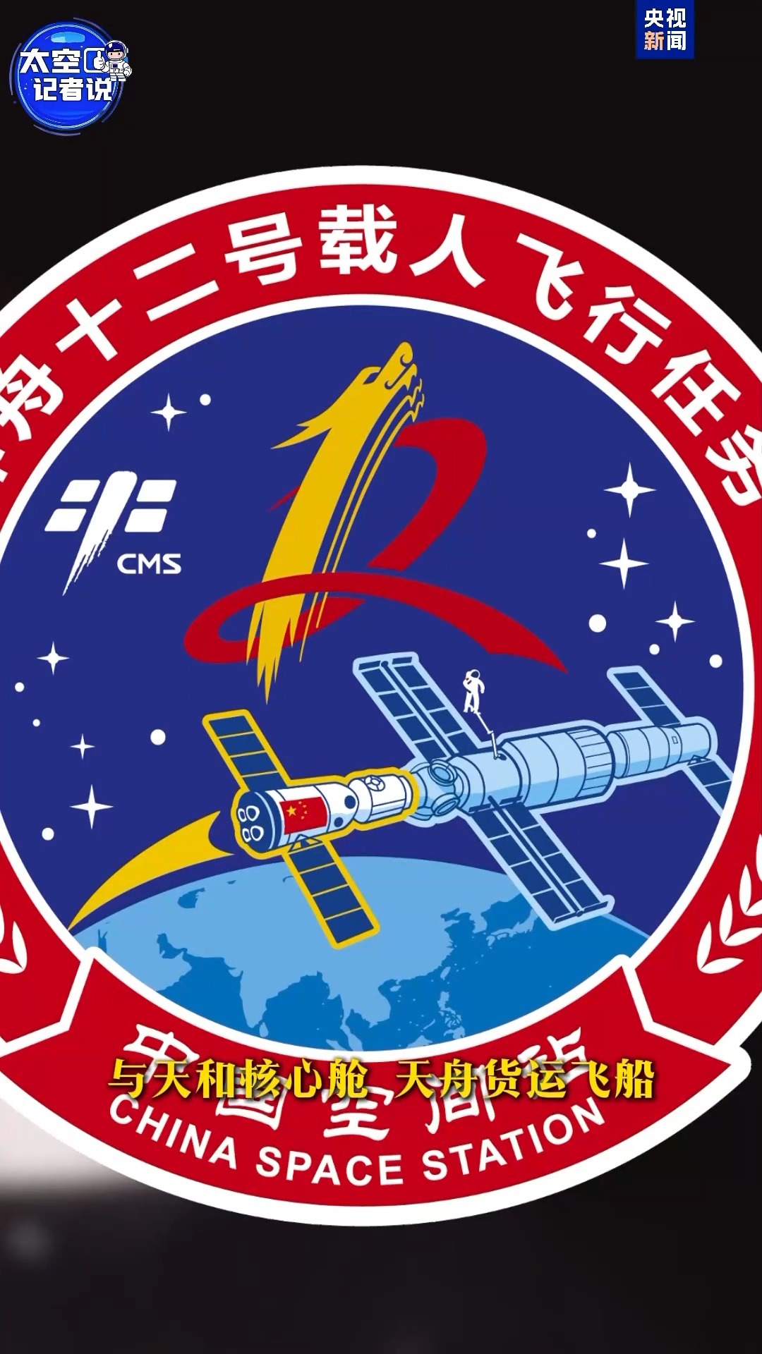 进入空间站时代,神舟十二号标识,正在奔向空间站的神舟飞船与天和核心舱、天舟货运飞船组成了“一”字构型,出舱的航天员表明了此次任务是中国载人航天工程时隔十三年再次进行出舱活动。