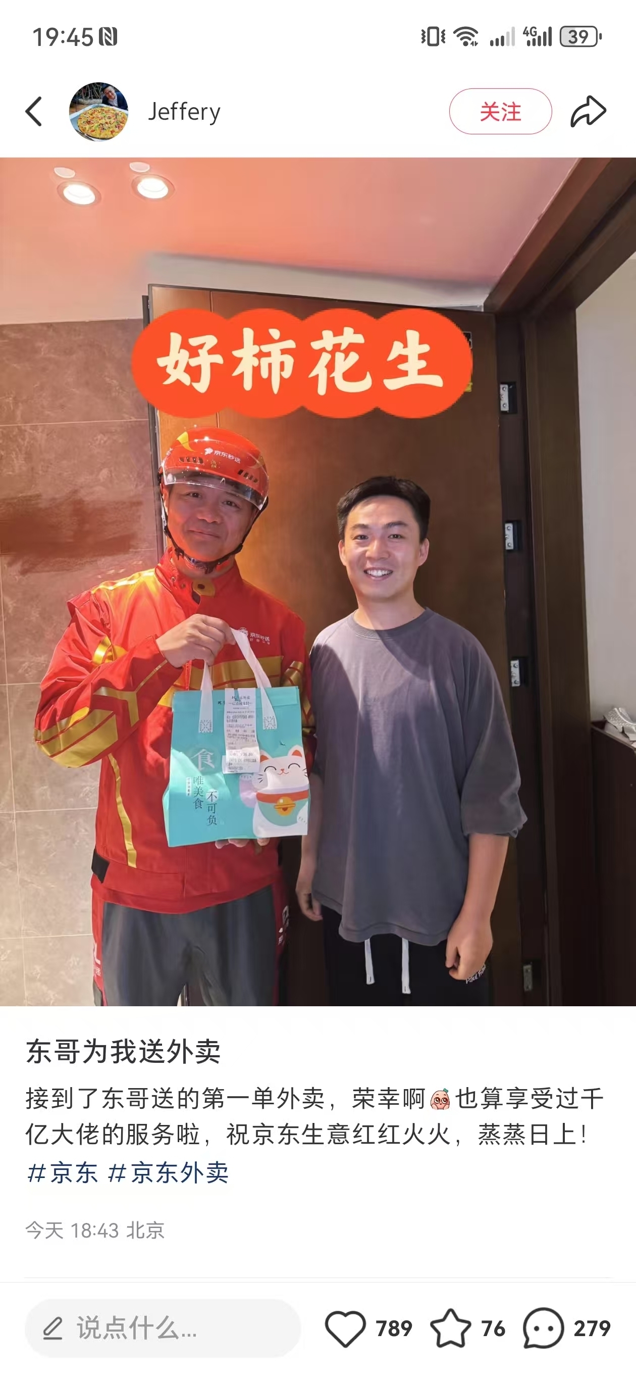 4月21日,有社交媒体用户发布京东创始人刘强东送外卖的照片,称“接到了东哥送的第一单外卖”。京东方面告诉红星资本局,这张照片属实,刘强东送外卖也属实。据悉,刘强东21日在参与外卖配送之后,还请外卖骑手们吃海底捞火锅。
