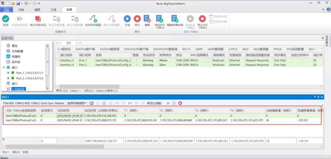 5.启动仪表1588协议,切换到1588协议统计界面,记录从时钟与主时钟的时间偏差。