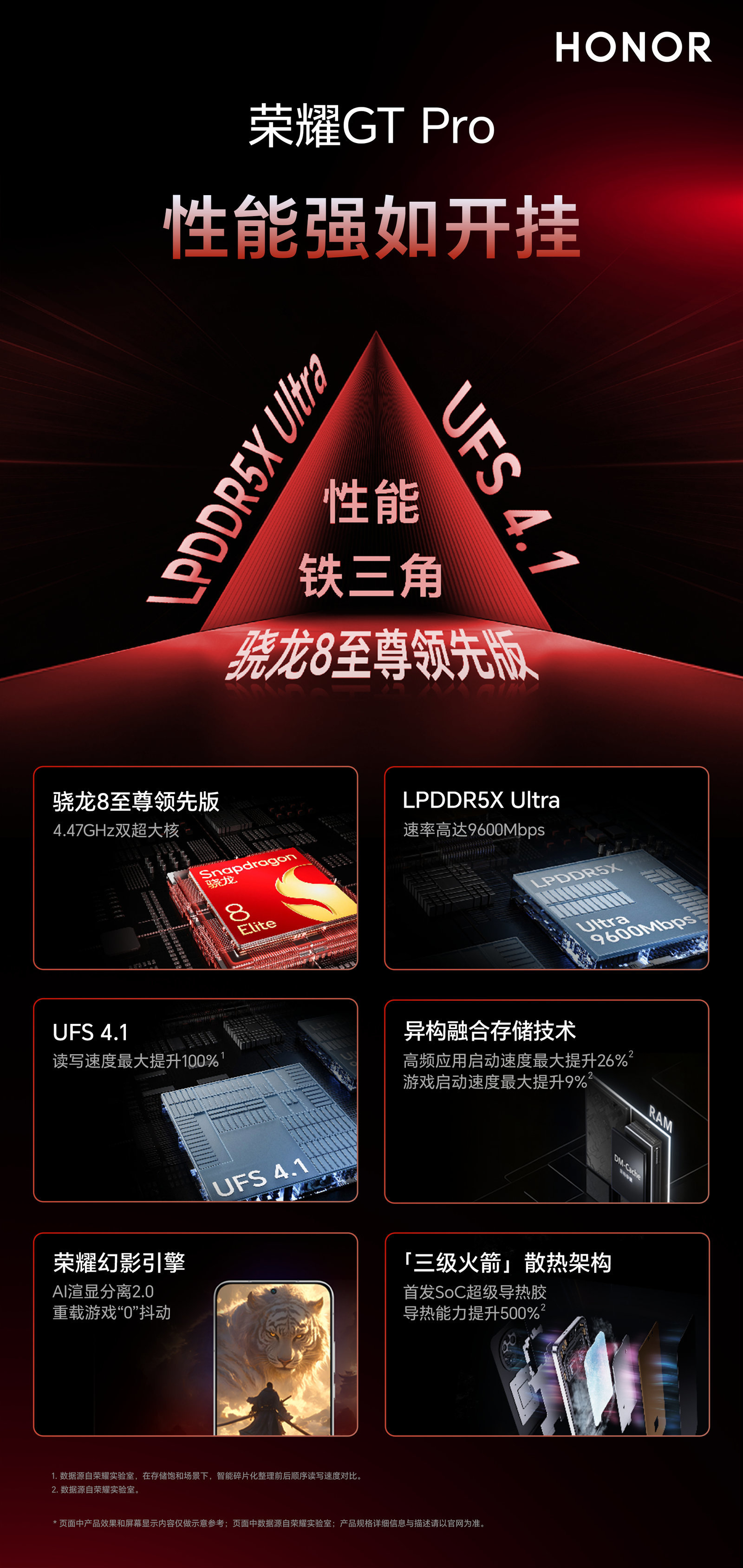 该新机搭载骁龙 8 至尊领先版、UFS 4.1闪存+ LPDDR5X Ultra内存三者组成“最强性能铁三角”,号称“满血性能,强如开挂”。新机还搭载荣耀幻影引擎、异构融合存储技术、「三级火箭」散热架构。