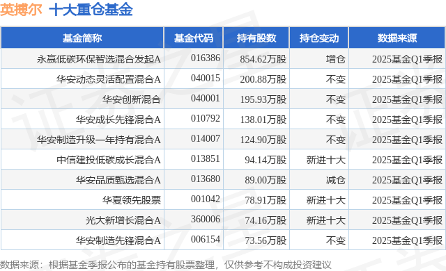 根据2025基金Q1季报公募基金重仓股数据,重仓该股的公募基金共33家,其中持有数量最多的公募基金为永赢基金的永赢低碳环保智选混合发起A。永赢低碳环保智选混合发起A目前规模为1.28亿元,最新净值0.8153(4月22日),较上一交易日下跌1.04%,近一年上涨20.25%。该公募基金现任基金经理为胡泽。胡泽在任的基金产品包括:永赢新能源智选混合发起A,管理时间为2024年7月15日至今,期间收益率为-26.52%;永赢高端制造混合A,管理时间为2024年7月29日至今,期间收益率为16.14%。