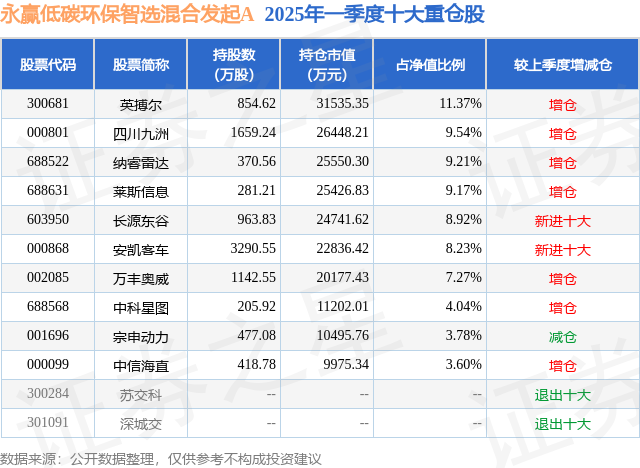永赢低碳环保智选混合发起A的前十大重仓股如下: