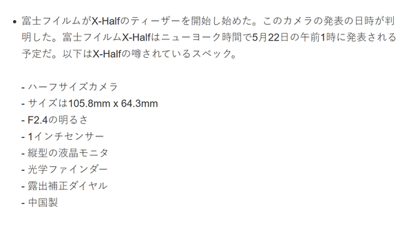 【CNMO科技消息】4月23日,CNMO了解到,海外媒体Fuji Rumors报道称,富士胶片计划于2025年5月22日凌晨1点(纽约时间)正式发布一款全新相机——“X-Half”。目前,富士胶片已经开始为这款相机进行预热宣传,并曝光了部分可能的规格参数。