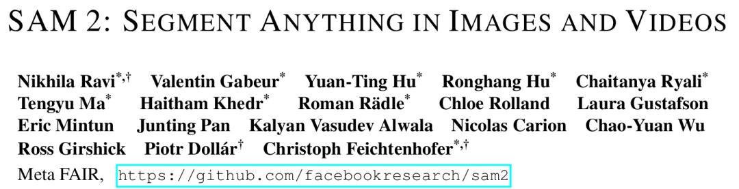 作者:Nikhila Ravi, Valentin Gabeur, Yuan-Ting Hu, Ronghang Hu, Chaitanya Ryali, Tengyu Ma, Haitham Khedr, Roman Rädle, Chloe Rolland, Laura Gustafson, Eric Mintun, Junting Pan, Kalyan Vasudev Alwala, Nicolas Carion, Chao-Yuan Wu, Ross Girshick, Piotr Dollar, Christoph Feichtenhofer