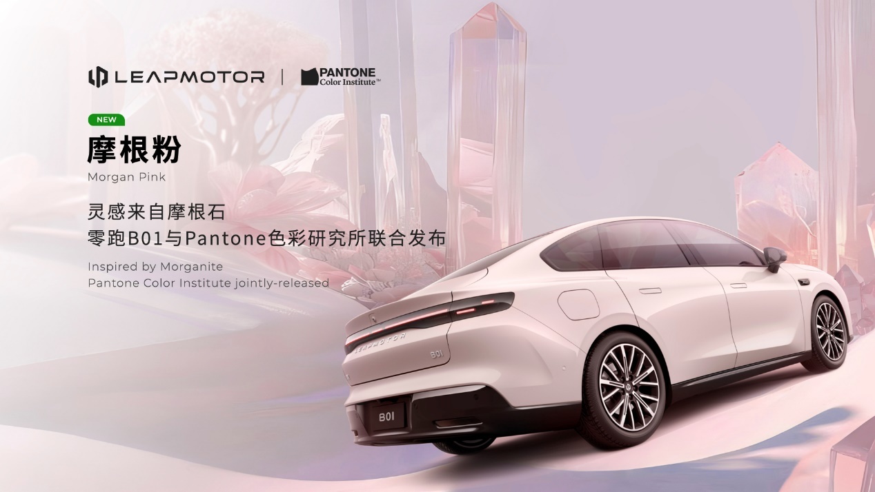 新车推出了8种车身颜色。新亮相的"摩根粉"是零跑与国际知名色彩机构——Pantone潘通,共同发布的全新配色,摩根石因含有微量锰元素,金属漆面在阳光下呈现跃动的浪漫粉色微光,承载着自信与勇气的美好寓意。