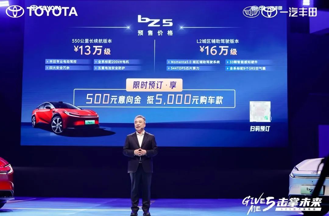 4月22日,丰田bZ5开启预售,新车共推出两款车型,预售价格区间为13-16万元,将于6月份正式上市。bZ5其实是bZ3C的换名车型,定位是中型SUV,是一台纯电车型。在发布会上,官方给出了预订权益,预订限时可享500元意向金抵5000元购车款。