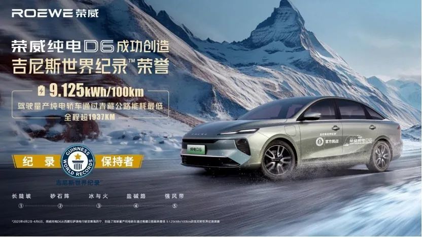 该车的节能实力得到吉尼斯世界纪录与中汽中心的双重权威认证。在严苛的青藏公路测试中,荣威纯电 D6 以 9.125kWh/100km 的超低电耗,成功斩获 “驾驶量产纯电轿车通过青藏公路能耗最低” 的吉尼斯世界纪录。