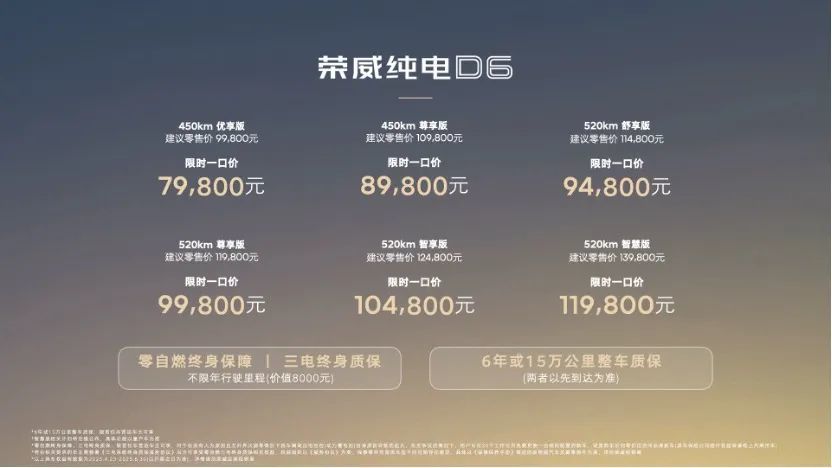 在新能源汽车市场竞争愈发激烈的当下,荣威纯电 D6 的登场,宛如一颗重磅炸弹,掀起了 A + 级轿车市场的波澜。尤其是7.98 万起的限时一口价,使其快速切入 A+ 级轿车赛道。搭配行业领先的 “零自燃保障” 和 “三电终身质保” 双重权益,荣威纯电 D6 以极具诚意的姿态,向消费者展示着技术普惠的决心。