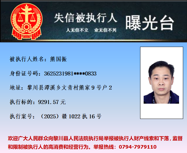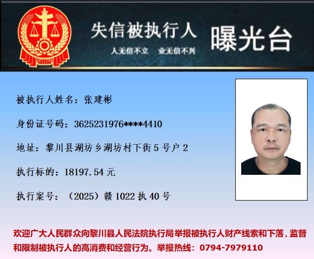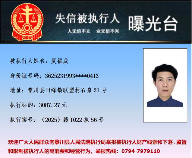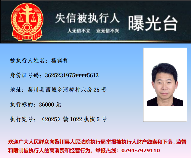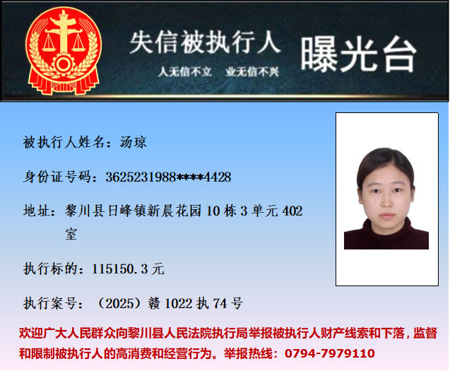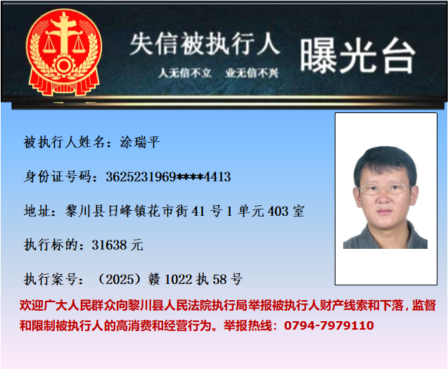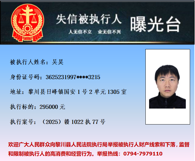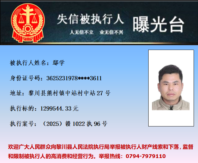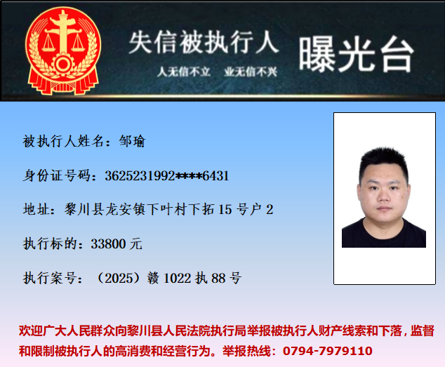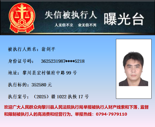 为促使被执行人履行生效法律文书确定的义务,推进社会诚信体系建设,依据《中华人民共和国民事诉讼法》等法律和最高人民法院相关司法解释的规定,现对以下失信被执行人予以曝光。欢迎举报失信被执行人行踪及财产线索 。执行举报电话:(0794)7979110。