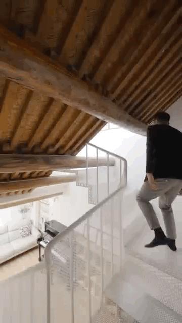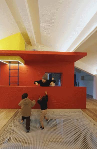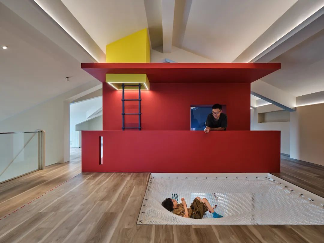 阁楼重新组织结构,形成环绕核心筒的动线,楼板挖空装绳网