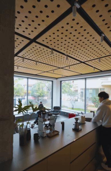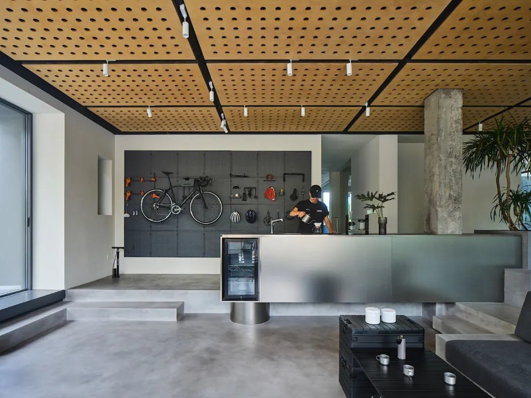 车库咖啡厅内原始的混凝土裸柱与金属台面穿插,形成咖啡制作操作平台;墙面洞洞板上可以放置各种配件工具,同时也是展示区