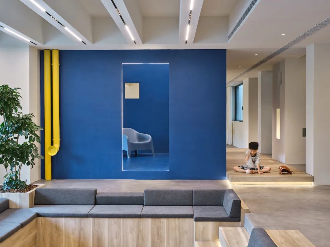 蓝色盒子空间连接一层户外和二层室内,洞口与核心筒的孔洞相互呼应;墙上的传声筒装置为室内增添趣味性