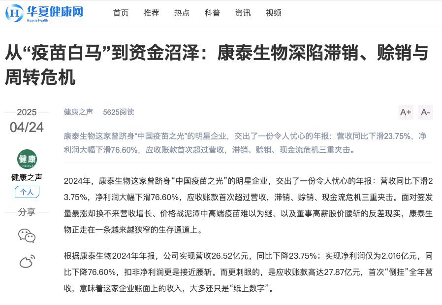 2024年,康泰生物这家曾跻身“中国疫苗之光”的明星企业,交出了一份令人忧心的年报:营收同比下滑23.75%,净利润大幅下滑76.60%,应收账款首次超过营收,滞销、赊销、现金流危机三重夹击。面对签发量暴涨却换不来营收增长、价格战泥潭中高端疫苗难以为继、以及董事高薪股价腰斩的反差现实,康泰生物正走在一条越来越狭窄的生存通道上。