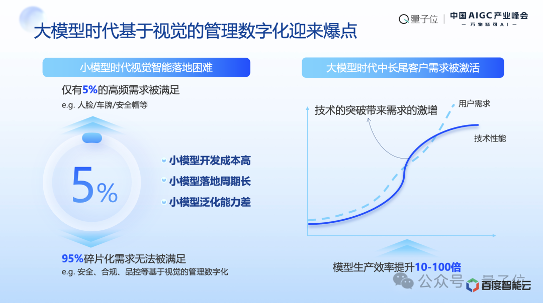 大模型时代,我们发现大小模型相结合,随着多模态技术不断发展,模型底层精度不断提升,泛化能力提升了以后,我们能看到整个AI视觉技能的生产成本,调优成本是显著降低的,而且碎片化的需求是有非常大的可能性会被标准化的产品来满足。