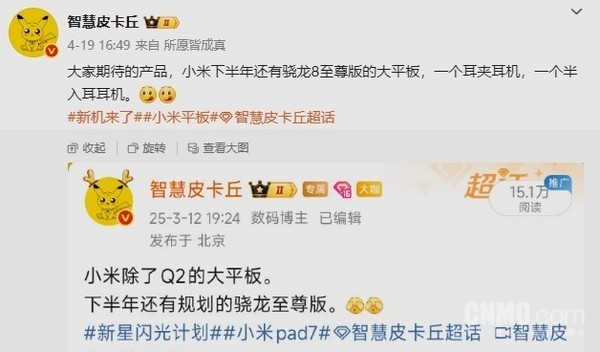 根据数码博主爆料,小米计划于2025年下半年推出三款智能新品,包括搭载骁龙8至尊版的高性能平板、耳夹式耳机及半入耳式耳机。