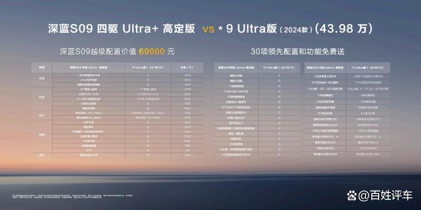 深蓝S09作为一台“家庭大六座智慧旗舰SUV”,从产品力来看,它完全就是一台为年轻奋进者打造的家庭大六座智慧旗舰SUV,30万价格获得百万级享受,不得不说非常具有吸引力。从“体验领先、价值越级”的驾乘体验,到为用户带来更具魅力的智慧出行,无论产品价值和品牌实力方面,深蓝S09不输给市面上任何一款同类产品,相较而言,深蓝S09空间全面越界,智能超乎所想,担得起大六座9系新标杆。而且,拥有深蓝超级增程2.0,华为全家桶、全新平台和底盘等一系列行业领先的技术优势的深蓝S09,更能重新构建旗舰大六座SUV的标准。让更高级的享受唾手可得,把体验升上去,把价格打下来,深蓝S09智能豪华真平权,正在30万级大六座SUV市场,打响“越级之战”!如果你正在为家人选择一辆大六座SUV,那就选深蓝S09,大六座9系新标杆,无需多问,无需多想,闭眼入!