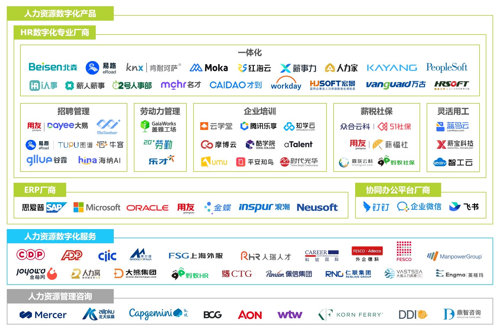 注释:1. 按服务商的主营业务类别划分,如“人力资源数字化产品”对应厂商也可能提供人力资源服务,“人力资源数字化服务”供应商也可能出售产品;2. “人力资源数字化产品”大类中,“HR数字化专业厂商”的业务仅聚焦于人力资源领域,其他类别厂商为“跨界”玩家;3. 仅展示部分典型企业,图谱中所展示的公司logo顺序及大小并无实际意义。