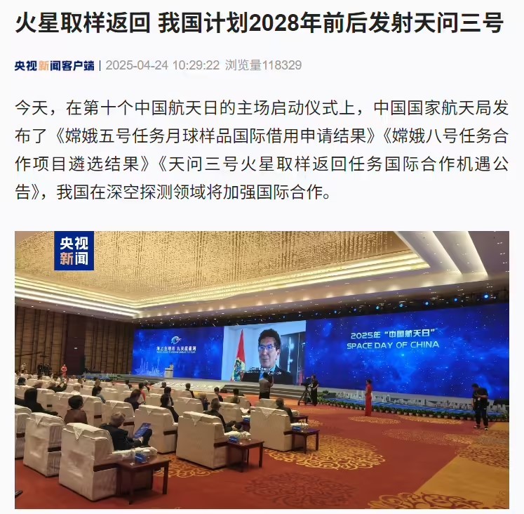 除了嫦娥探月工程,中国国家航天局还面向国际社会发布了《天问三号火星取样返回任务国际合作机遇公告》,共开放天问三号探测器 20 千克质量资源,与国际同行共同开展火星探测与研究。