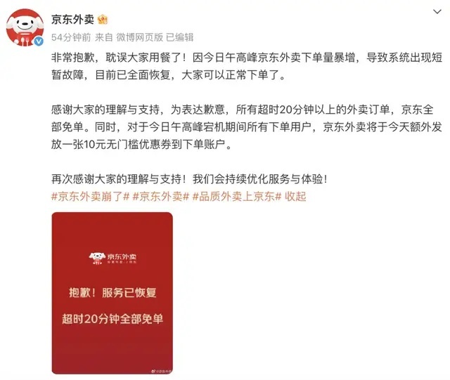 感谢大家的理解与支持,为表达歉意,所有超时20分钟以上的外卖订单,京东全部免单。同时,对于今日午高峰宕机期间所有下单用户,京东外卖将于今天额外发放一张10元无门槛优惠券到下单账户。