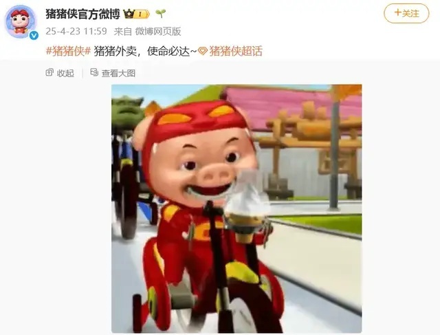 4月23日,猪猪侠官方微博发文:猪猪外卖,使命必达。疑似与最近的网络热梗呼应。不少网友评论“太有梗了”“那我要点一份”“我也想吃阿猪送的外卖”。