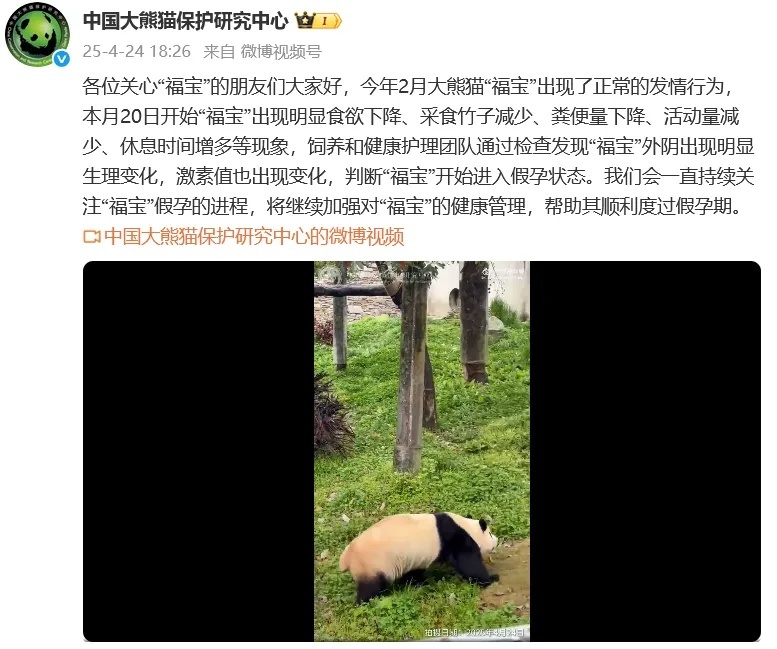 4月24日晚,中国大熊猫保护研究中心透露,“福宝”开始进入假孕状态。