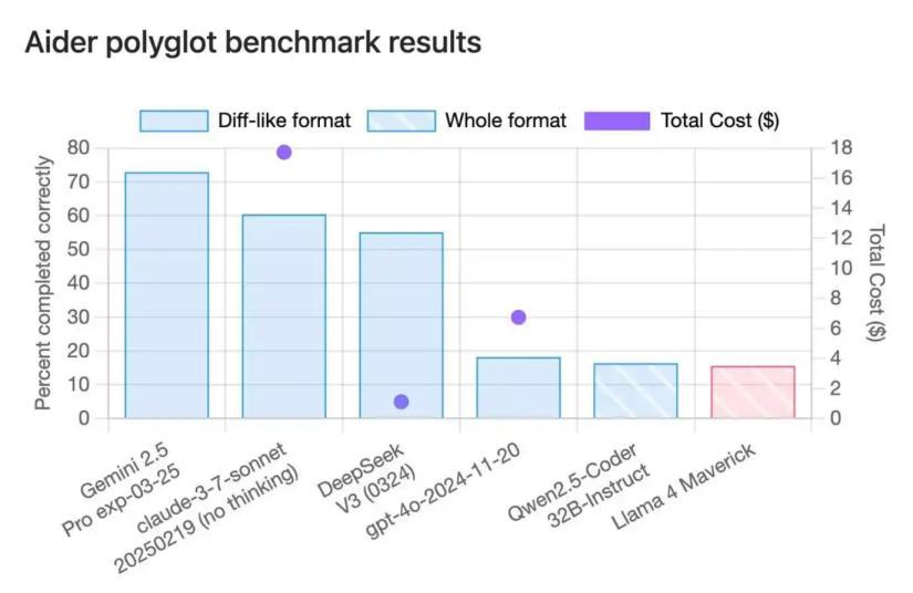 代码能力差强人意。在Polyglot编程测试中,Maverick版本的正确率仅为15.6%~16%,几乎垫底,与Meta声称的“编码能力超越DeepSeek”严重不符。其402B的参数规模并未带来优势,反而被32B参数的Qwen-QwQ等模型超越,基准测试结果严重失真。