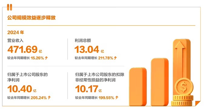 从报告获悉,该公司 2024 年实现营业收入 471.69 亿元,较去年同期增长 15.26%;实现归属于上市公司股东的净利润 10.40 亿元,较去年同期增长 205.24%;归属于上市公司股东的扣除非经常性损益的净利润 10.17 亿元,较去年同期增长 199.55%。