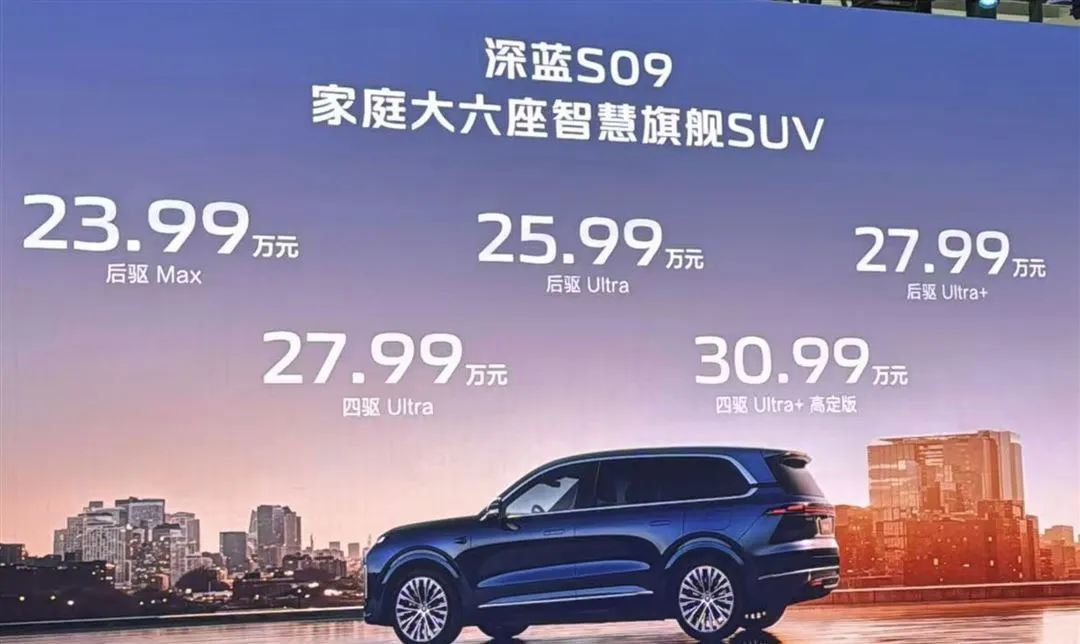 4月23日,上海车展现场,深蓝S09正式开启预售,共推出5款车型,预售价区间为23.99-30.99万元。深蓝S09定位是大型豪华SUV,采用增程动力方案,“2+2+2”的六座布局。核心竞品是理想L9、问界M9,而这个预售价格可以说是很有惊喜了。不仅如此,首批用户专享7项权益,价值超83359元。