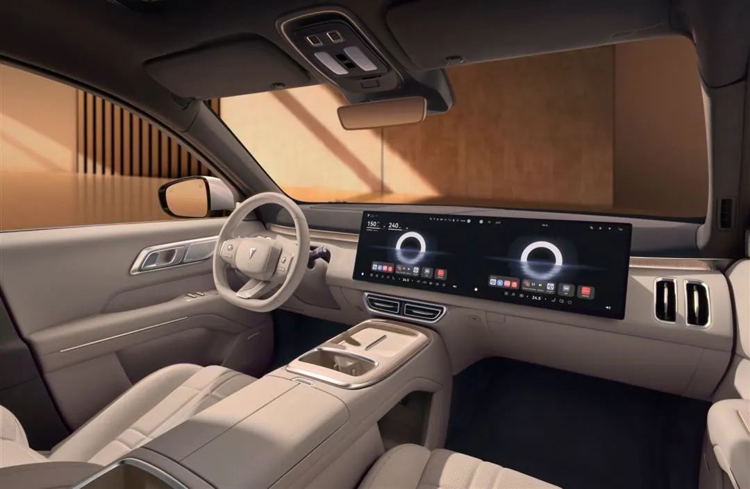 拉开车门,深蓝S09提供前排双15.6英寸联屏+43英寸AR-HUD抬头显示,屏幕支持2.5K分辨率、1000尼特亮度,并配备HarmonySpace 5鸿蒙座舱。