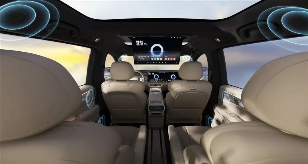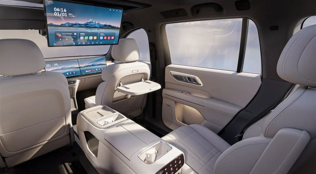 2+2+2的座椅布局,第二排为双独立式座椅,每张座椅均带有独立式扶手并支持座椅按摩/通风/加热,扶手内侧设计有座椅多功能控制按键,支持160毫米横向滑动调节。此外,副驾侧第二排座位可提供小桌板,方便乘客使用。第二排还配备21.4英寸3K后排娱乐屏,支持16:9比例调节、0 - 75度屏幕位置角度可调。