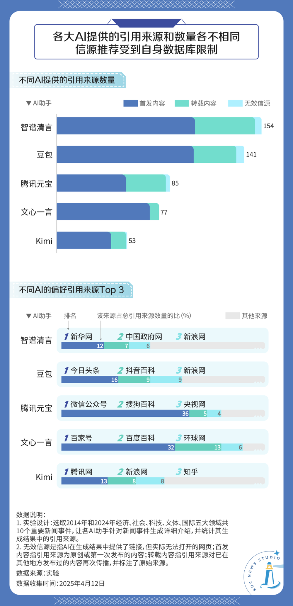 为此,我们设计了一个实验:以智谱清言、豆包、腾讯元宝(DeepSeek R1)、文心一言、Kimi这五个目前国内使用人数较多的国产AI助手为实验对象,分别选取2014年和2024年的经济、社会、科技、文体、国际五大领域共10个新闻事件,要求AI针对新闻事件生成详细介绍,并统计AI回答中的引用来源类型及数量。