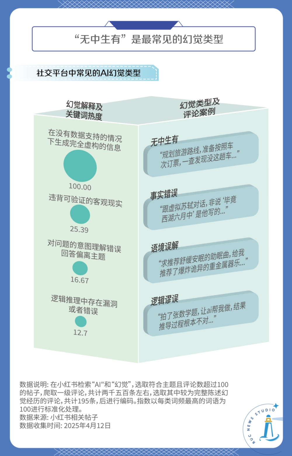 那幻觉在具体应用场景中又以怎样的形态呈现呢?为了更规范地进行描述,我们总结了几篇国内外文献的观点,将幻觉分为了四类[2]。然后以“AI”和“幻觉”为关键词在小红书进行检索,选取符合主题且评论数超过100的帖子,爬取了所有的一级评论,共计2486条。接着从中筛选195条较为完整的、描述幻觉经历的评论,根据分类对这些幻觉进行编码。分类和统计结果如下: