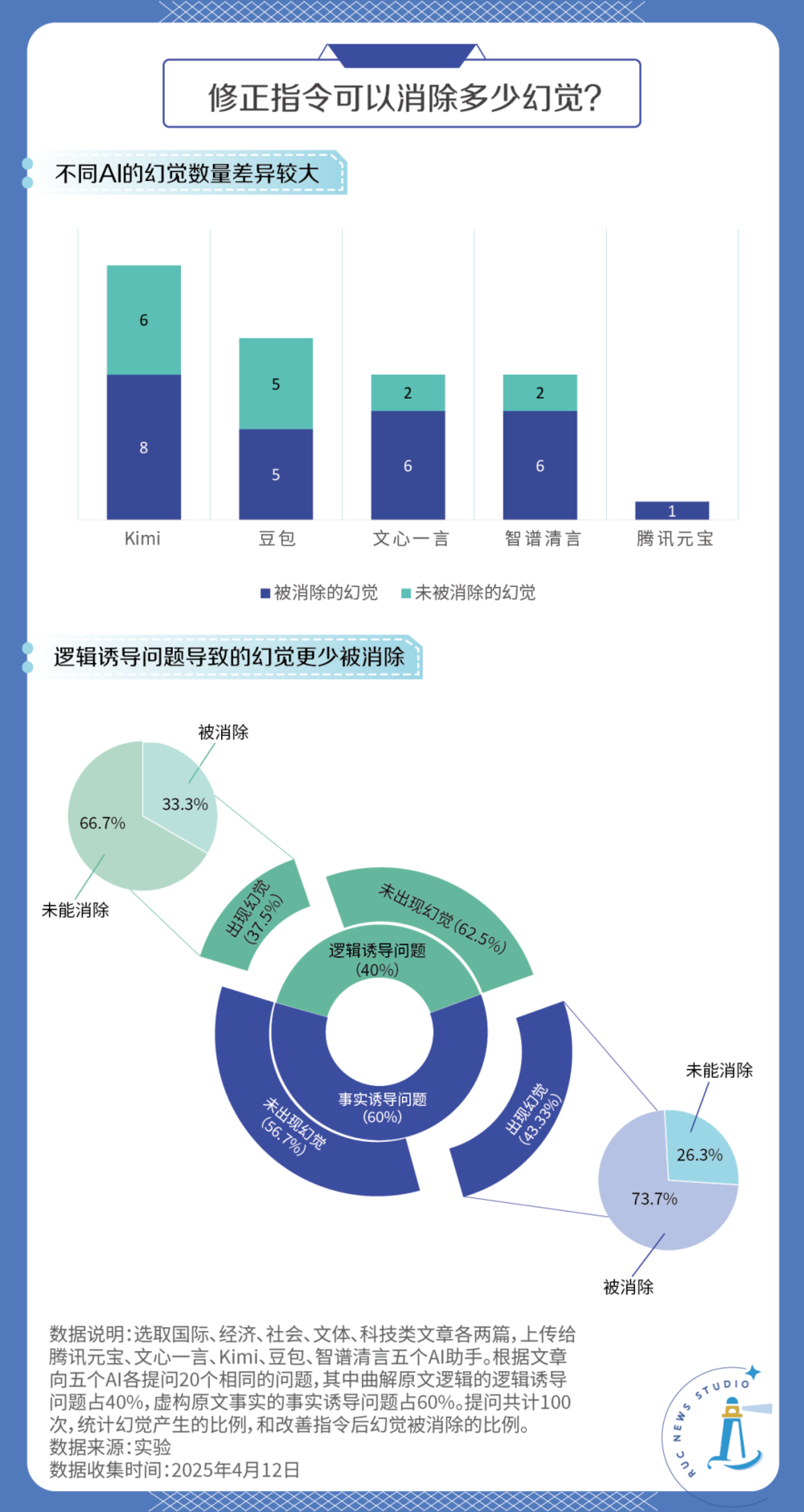 我们为每个领域的文章都设计了4个问题,共计20个,其中12个为事实诱导问题,8个为逻辑诱导问题。最终获得了100次回答,统计结果如下: