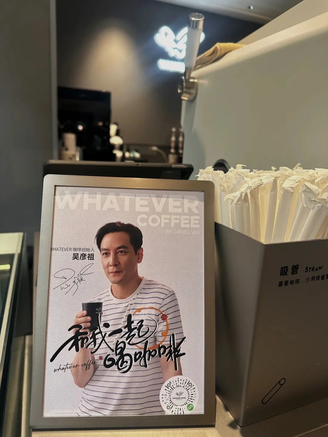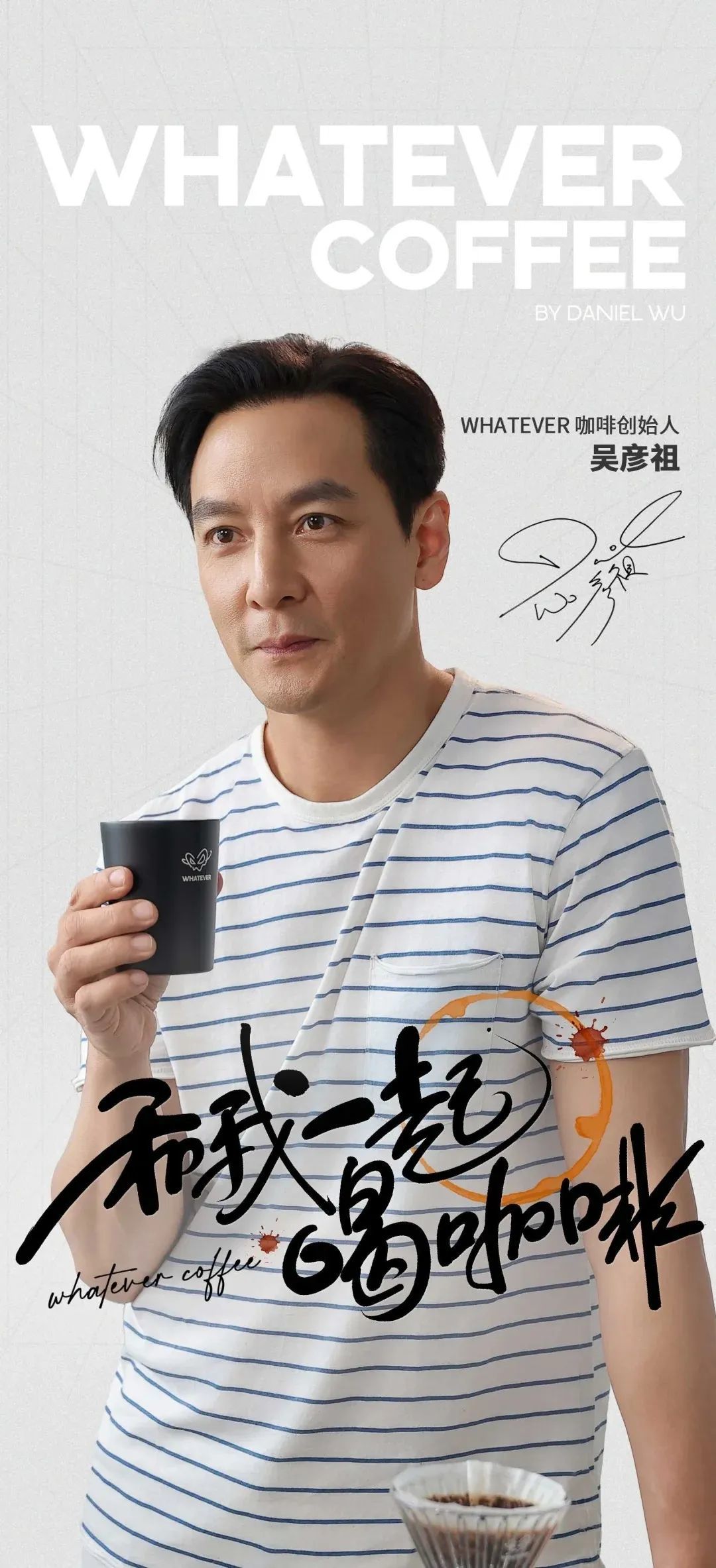 这家店以“无所谓WHATEVER”为名,不仅承载了他对真实自我的追求,也体现了品牌对自由、随性与真实生活方式的倡导。海报上的吴彦祖穿着简单的条纹T恤,搭配黑色咖啡杯,视觉上干净、自然,与品牌的“简约但有态度”理念一致。
