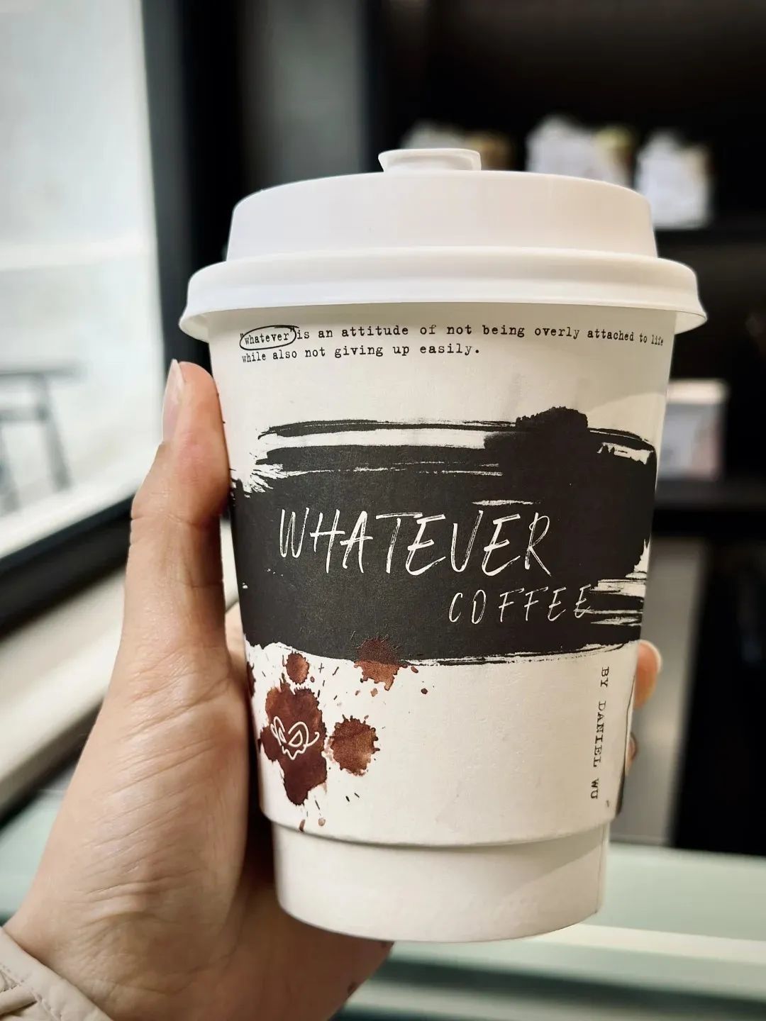 “WHATEVER” 采用手写风格的斜体字,不规则的笔触给人一种随意、不拘一格的感觉,符合品牌自由、无拘束的调性。LOGO 中出现了一些咖啡渍泼洒的效果,模拟了现实中的不小心洒出的咖啡痕迹,这种不完美的设计增强了品牌的真实性和随性美学。
