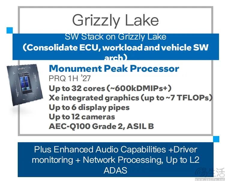 根据这些资料不难发现,在英特尔原本的规划中,基于RPL-H、也就是13代酷睿架构的Malibou Lake平台,应该从今年开始、一直到2026年,都是他们在车载计算市场里的“挑大梁”产品。直到2027年它才会被新的Grizzly Lake所取代,而后者使用代号为“Monument Peak”的处理器,则拥有最多32核心,并集成了算力高达7TFlops的Xe核显。