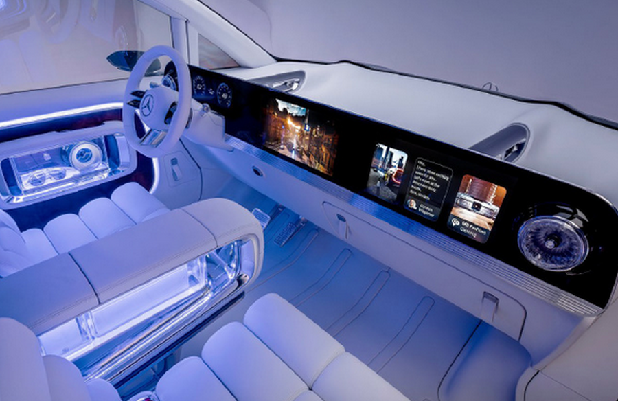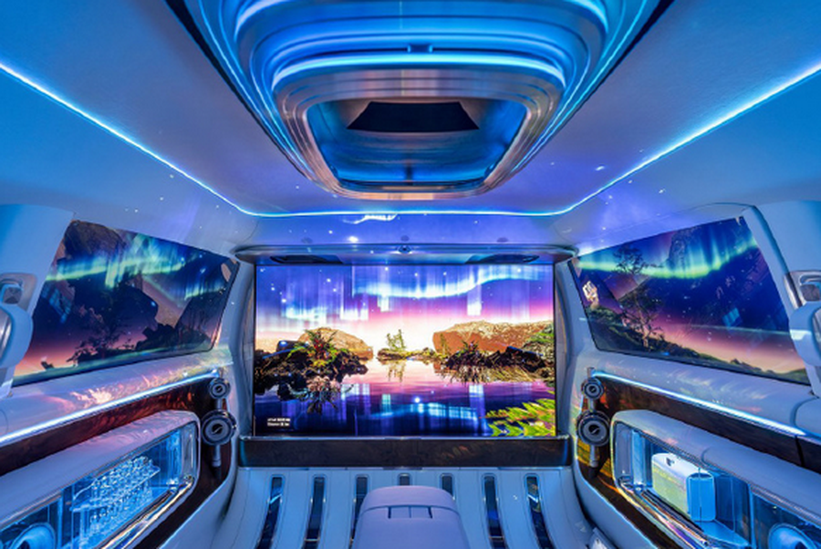 车内则呈现出梦幻般的豪华配置。Vision V配备了一块65寸可伸缩的4K电视屏幕和42个扬声器的杜比全景声环绕立体声系统,带来震撼的音响效果。座椅内部设有振动器,能为乘客提供与音乐相关的反馈。此外,车内还具备玻璃隔板,透明度可调以保护隐私,座椅可以电动调节,甚至配备了一瓶“精致香水”以增添氛围。国际象棋等娱乐设施也进一步提升了车内的休闲体验。