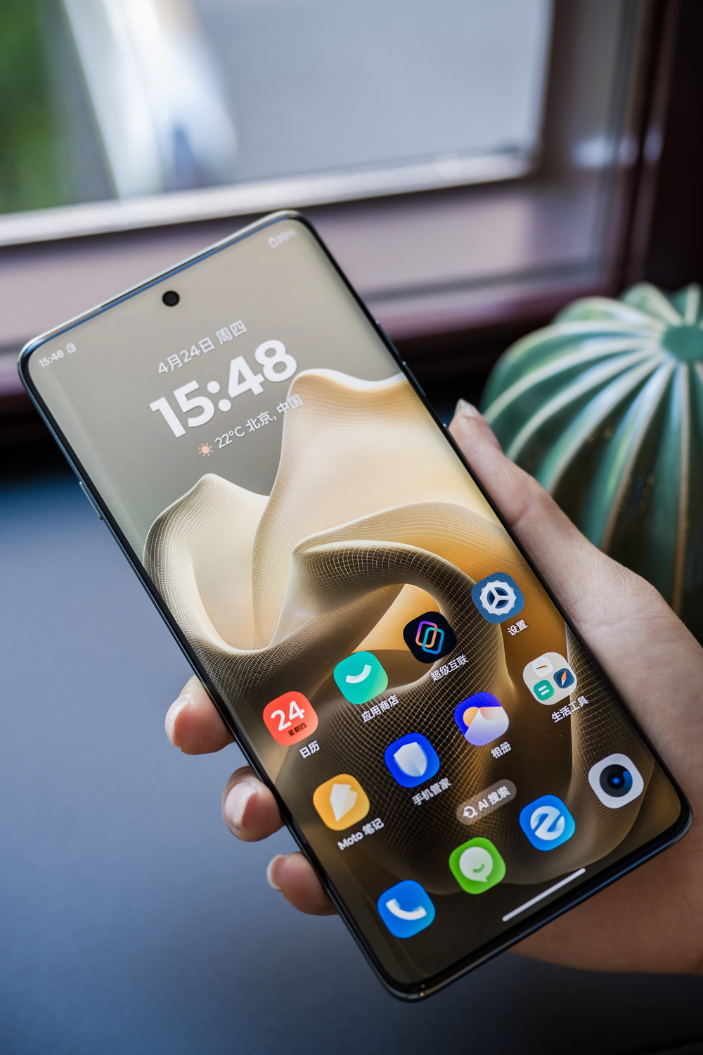 该机正面采用四曲面屏幕,从正面一看就让人有种眼前一亮的感觉,整个屏幕大气通透,但又显得很沉稳,尤其点亮屏幕后,经典的操作系统又把人们带入了moto时代。