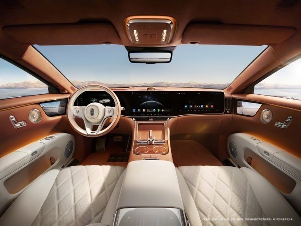 从官方公布的图片中可以发现,车辆内部采用了大面积的棕色配色,营造出一种古典奢华的氛围。车辆配备了一块超宽的贯穿式三联屏,两侧还有两块屏幕用于电子后视镜显示,配合上HUD头显,光前排就有六块屏幕,可谓是科技感十足。