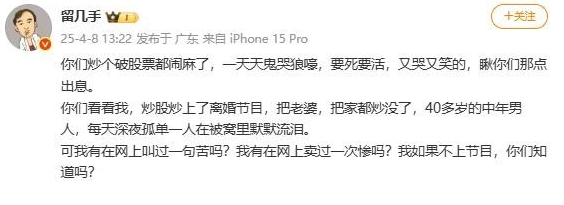 有网红炒股大赚,也有网红炒股巨亏的。今年4月初,网红“留几手”透露自己炒股亏了480万元。针对不少人抱怨股市大跌,其表示,“你们看看我,炒股炒上了离婚节目,把老婆,把家都炒没了,40多岁的中年男人,每天深夜孤单一人在被窝里默默流泪。”