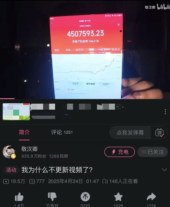 4月24日,拥有千万粉丝的短视频博主敬汉卿发视频回应停更。他表示,从去年开始基本就在全职炒股,目前收益有450万,跑赢了拍视频的收益。