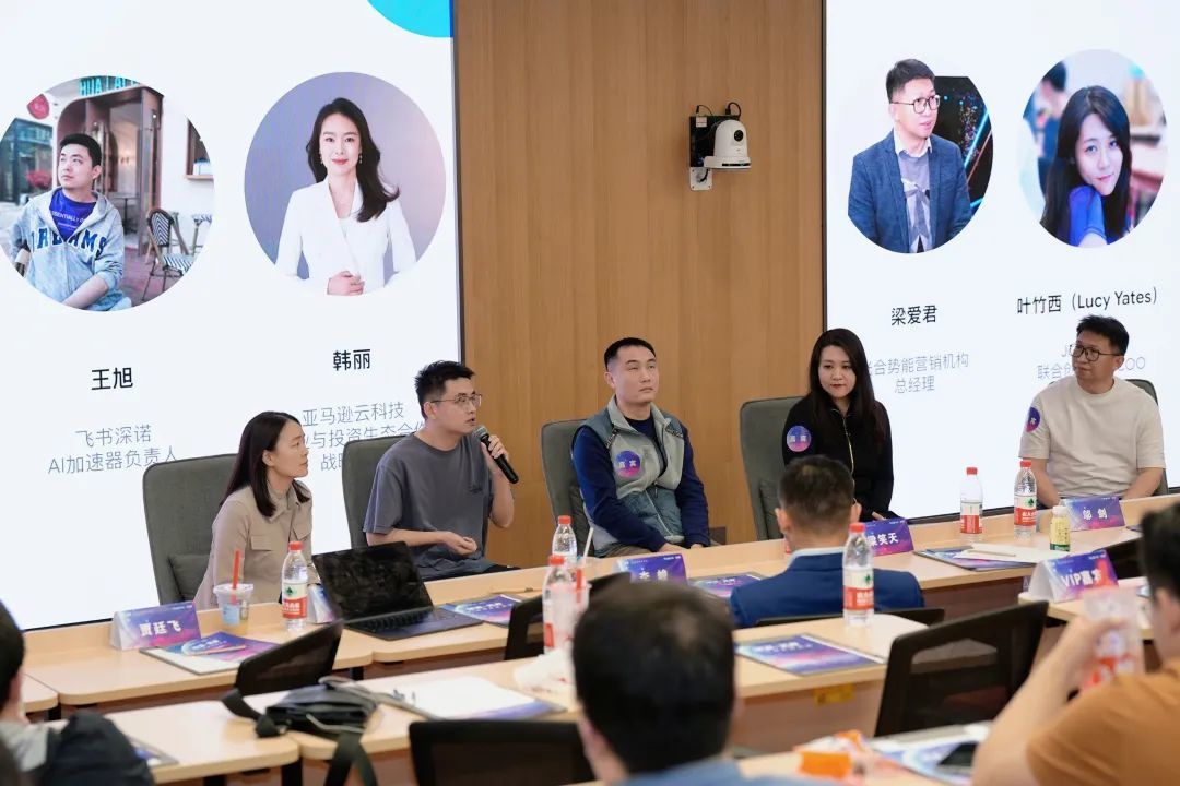 左起:亚马逊云科技创业与投资生态合作战略顾问 韩丽、飞书深诺AI加速器负责人 王旭、彩漩科技创始人兼CEO 邬剑、jobwizard.ai联合创始人兼COO 叶竹西、光合势能营销机构总经理 梁爱君