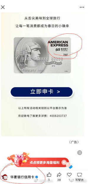 今日,华夏银行信用卡官方微信公众号发布题为《出游带上运通卡叠享奖励超2000元!》推广文章,内容中明确标注"玩购世界,支付就用华夏运通新贵卡",但配图却出现明显错误——所展示信用卡卡面赫然印有"浦发银行"字样及LOGO。