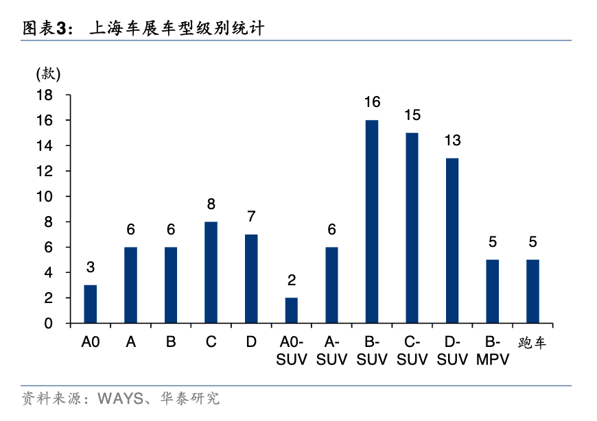 今年的上海车展,SUV成了绝对主角。根据威尔森统计,本次车展参展车型达97款(其中全新车型43款),SUV占比高达53%,B级(中型)和C级(大型)SUV占比32%。