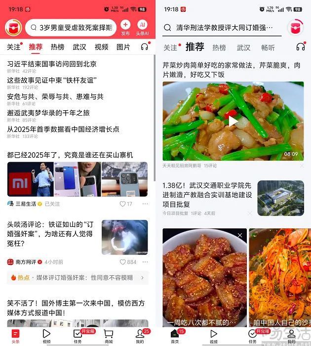 作为今日头条的出品,爱看App不出意外地与今日头条App“高度撞脸”。不论在页面布局、还是使用逻辑上,两者都有诸多相似之处。