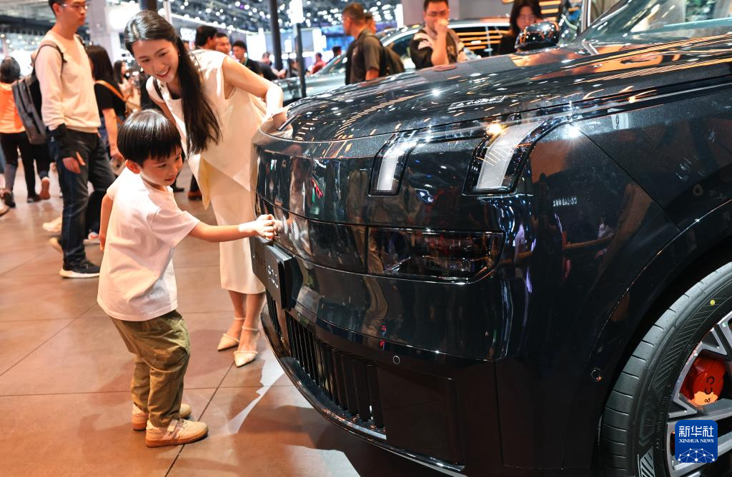 4月25日,小朋友与领克汽车上显示的小猫图案互动。