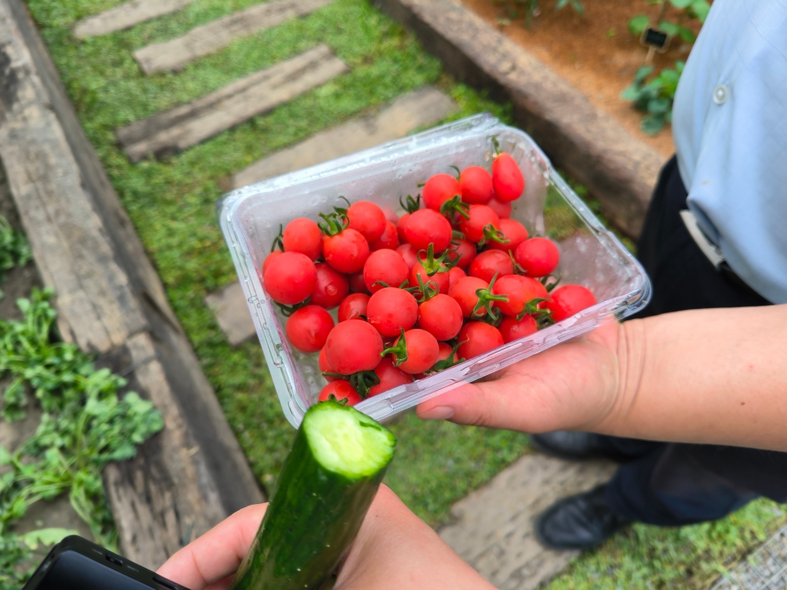 记者品尝当天采摘的新鲜番茄和黄瓜。图/九派新闻 曾怡婷