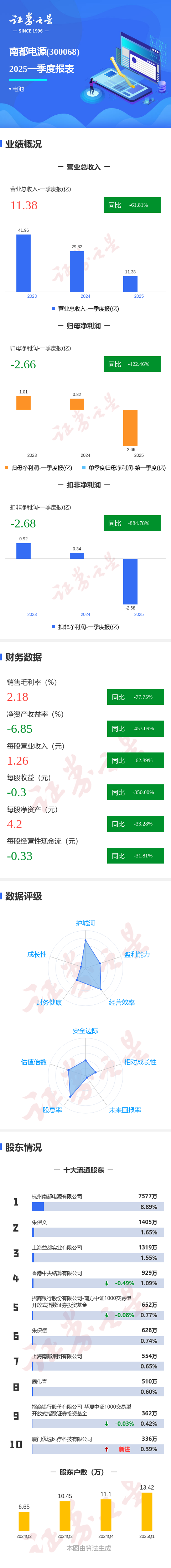 证券之星消息,南都电源2025年一季报显示,公司主营收入11.39亿元,同比下降61.81%;归母净利润-2.66亿元,同比下降422.47%;扣非净利润-2.68亿元,同比下降884.78%;负债率81.14%,投资收益-484.69万元,财务费用7988.38万元,毛利率2.18%。