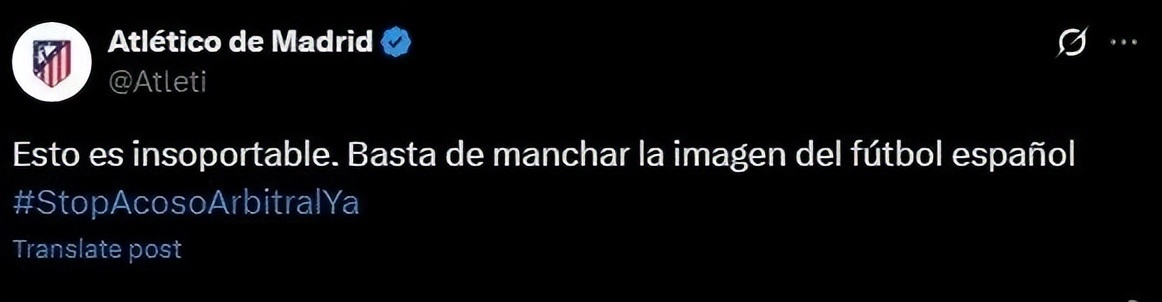随后,马德里竞技俱乐部官方发布了一条动态,疑似对皇马的国王杯决赛赛前风波作出评价:“这实在令人无法忍受。不要再玷污西班牙足球的形象了。”马竞官方附上了停止向裁判施压的tag。